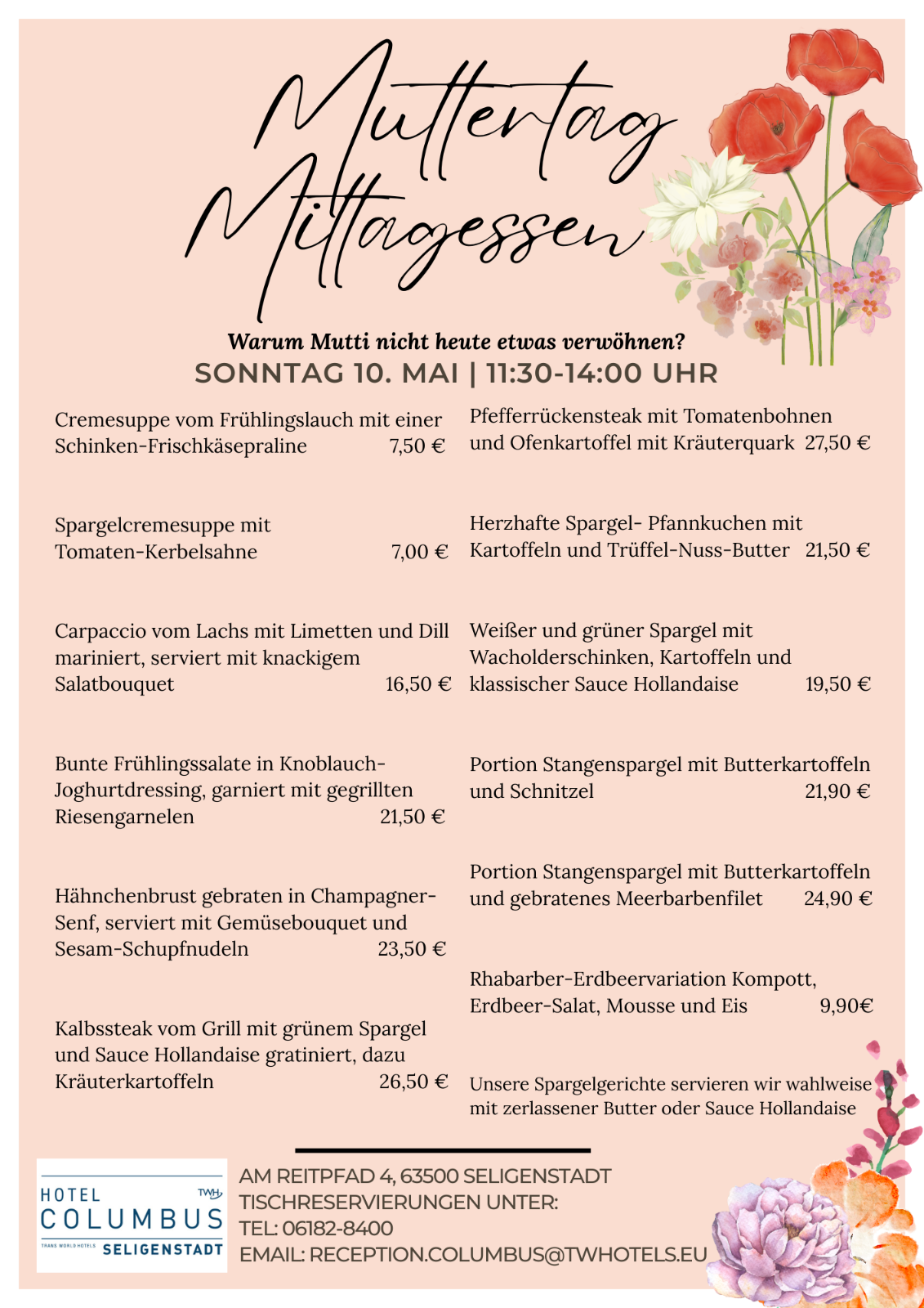 Wir haben für Sie ein besonderes Festtagsmenü vorbereitet, das jede Mama begeistert – von saisonalem Spargel bis hin zu unseren beliebtesten Desserts.